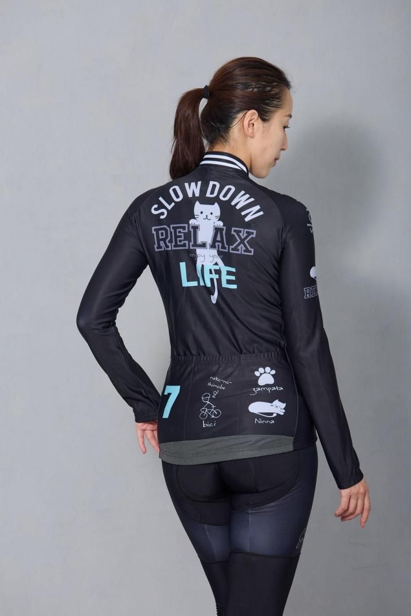 ロゴの後ろからぶら下がるネコと寝ているネコがメインモチーフの、コミカルでポップなデザインが特徴のサイクルジャージ。 ゆっくりサイクリングしてリラックスしようと言うメッセージを込めています。